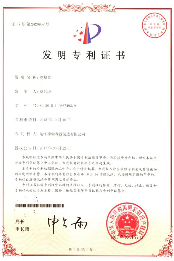 发明专利证书—冷却器